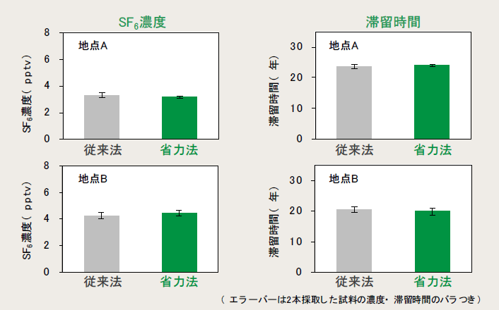 図4 従来法と省力法で採取した地下水中のSF 6 濃度および滞留時間の比較
