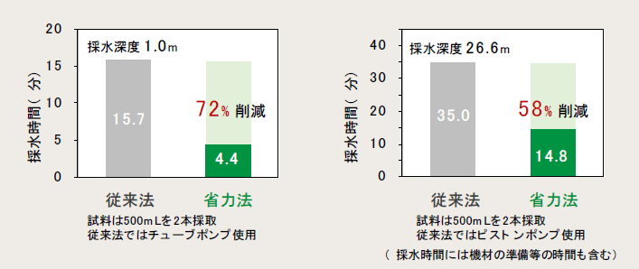 において、採水にかかる時間を最大で60~70%削減できる。また、本手法はポンプを使わないため調査機材の簡素化•軽量化が可能であり、調査者の負担軽減に貢献する。