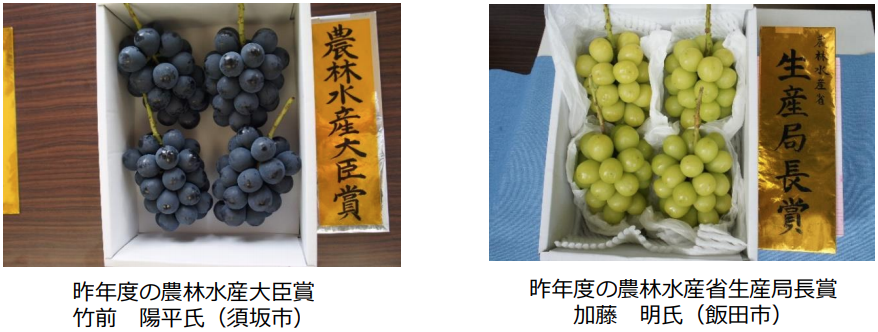 県オリジナル品種「ナガノパープル」と「シャインマスカット」の品質や生産技術を競う「うまいくだものコンクール」を開催し、農林水産大臣賞等を決定する。