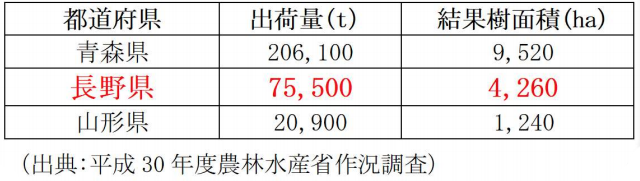 「ふじ」の生産状況は、国産りんごの収穫量の約半分は「ふじ」で、 日本を代表する品種。長野県は「ふじ」の出荷量、結果樹面積ともに全国2位を占めている。