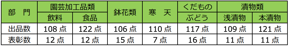 ※9月17日から11月4日に行われた品評会の受賞者(全84名)のうち、各部門の農林水産大臣賞(7 名)、長野県知事賞(1名)、各団体の賞(11名)の代表19名の方に賞状が授与される。※農林水産大臣賞受賞者の詳細は別紙をご覧ください。※くだものの部(りんご)及びきのこ類の部は台風19号の影響により開催中止となった。