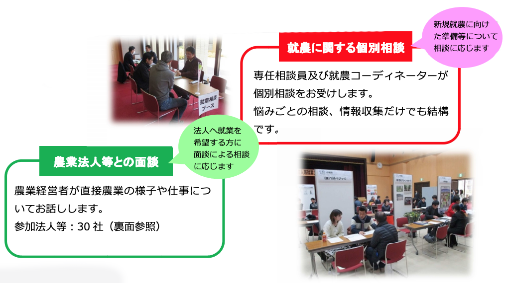 就農に関する個別相談では、専任相談員及び就農コーディネーターが個別相談を受ける。悩みの相談、情報収集だけでも結構。また新規就農に向けた準備等についても相談に応じる。農業法人等との面談では、農業経営者が直接農業の様子や仕事についてお話する。参加法人等は30社(裏面参照)、法人へ就業を希望する方には面談による相談に応じる。なお、参加申込等の参加費は無料。事前予約の必要はない。