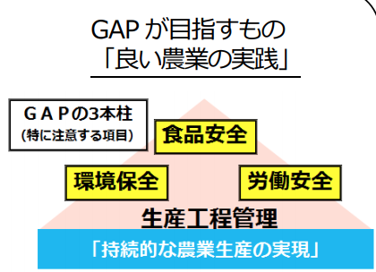 GAP(Good Aguricaltural Practice 農業生産工程管理)とは、農業生産活動の中で必要な関係法令などに則して定めた点検項目に沿って、農業生産における各工程の正確な実施、記録、点検及び評価を行い持続的に改善していく活動だ。GAP実践により「食品安全」「環境保全」「労働安全」が確保され、消費者の信頼確保、取引拡大等の効果が期待される。