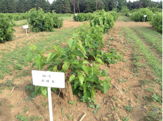 赤材桑(せきざいそう)(図1)は、大正元年頃に北海道の奥尻島で発見された桑の野生種で、夏場の成長期、茎や枝に鮮やかな赤い木材をつくります(図2)。発見当初、同島では赤材桑を紫桑(むらさきぐわ)や薬桑(くすりぐわ)と呼び、養蚕に加えて神事の供物や漢方薬の原料としても使っていたとされている。大正11年、当時東京の杉並にあった蚕業試験場に持ち込まれた穂木から苗木が作られたことを機に、同場の職員であった吉村武三吉氏によって赤材桑と名付けられた。それ以来、赤材桑は接ぎ木などで株分けされ、現在でも国内数か所で育てられている。
