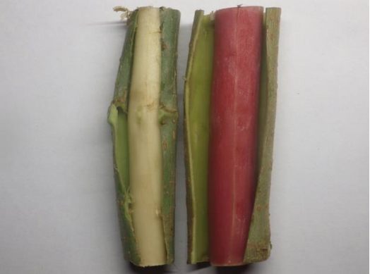 図2:剥皮した赤材桑の枝(右) 左は対照とした通常品種