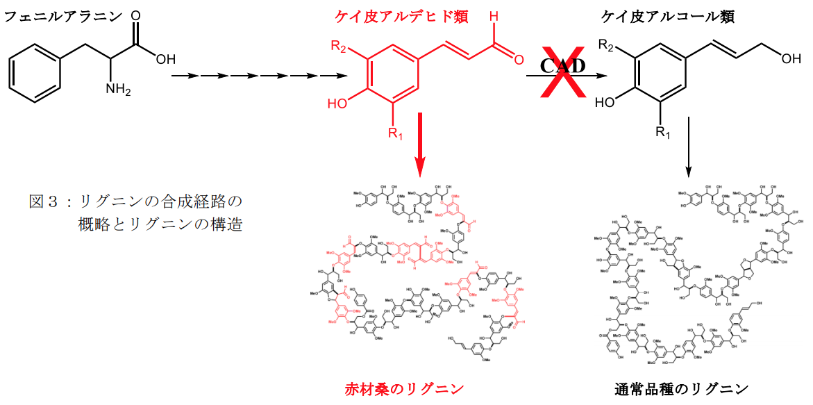 このことを確かめるために、研究グループは次世代シーケンサーで赤材桑と通常品種のゲノムDNAを解読し、CAD遺伝子の全塩基配列を決定した。その結果、通常品種では正常なCAD遺伝子が、 赤材桑では一塩基の挿入によって完全に壊れていることが分かった。通常品種ではCADの働きによりケイ皮アルコール類が合成され、これが重合することでリグニンが生成する。しかし赤材桑ではCAD遺伝子が破壊されているために十分な量のケイ皮アルコール類が合成できず、その代替としてケイ皮アルデヒド類が重合することにより、リグニンの構造が変化することが判明した(図3)。