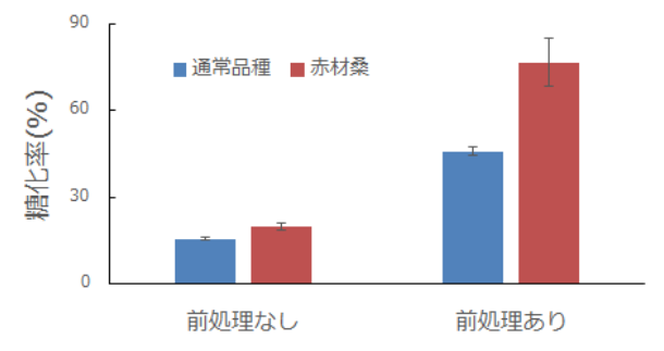 ケイ皮アルデヒド類のリグニンへの取り込みは、塩基性条件下でのリグニンの分解性を高め、その後の酵素処理による木材からの単糖の回収率(糖化率)向上に寄与することが期待される。実際にアルカリ溶液で前処理した木粉をセルラーゼで加水分解したところ、事前の期待どおり赤材桑の木材では糖化率が格段に向上した(図4)。