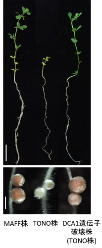 (下段)apn1変異体の根粒。スケールバー:1mm。 apn1変異体はミヤコグサ根粒菌MAFF株を接種した場合には、窒素固定活性のある根粒を形成し、窒素栄養を与えない条件でも地上部がよく成長する(左写真)のに対し、ミヤコグサ根粒菌TONO株を接種した場合には、窒素固定活性の低い根粒を着生し、地上部がほとんど成長しません(中央写真)。一方、DCA1遺伝子を破壊したTONO株はapn1変異体において窒素固定活性のある根粒を形成できます(右写真)。