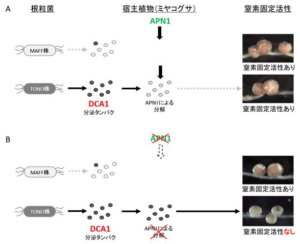 MAFF株、TONO株は共にオートトランスポーター遺伝子(DCA1)を有するが、TONO株はMAFF株に比べてDCA1を多量に合成する。A:APN1が機能する野生型ミヤコグサの場合。MAFF株、TONO株のDCA1から分泌されるタンパクがAPN1によって分解されることで、窒素固定活性の低下が阻止され、窒素固定活性を持つピンク色の根粒ができる。B:APN1が機能しないapn1変異体の場合。 MAFF株はDCA1分泌タンパクの量が少ないため、APN1によるタンパク分解がなくても窒素固定活性は維持される。一方、TONO株が感染した根粒では、TONO株が合成する多量のDCA1分泌タンパクが分解されないため窒素固定活性が低下し、窒素固定活性のない根粒が形成される。