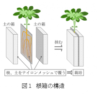 まず、課題1と2を解決するため、新しく「根箱」という栽培容器を作製した。図1で根箱の構造を示している。まず実験に用いる植物を栽培する際に、図1の左側の絵にあるような四角のナイロンメッシュ袋で根を包むことで、撮像対象がはみ出ないように根の生長する範囲を限定させる。また二つのプラスチック容器も、それぞれに土を入れてからナイロンメッシュ袋で包み、撮像対象となる土の形が崩れないようにする。これを図1の右側の絵で示すように、根をサンドイッチ状に挟み植物を育てる。植物は根箱内の土から養分と水分を吸収し、土や微生物と根圏を形成しながら成長する。この根箱は立体的で複雑に成長する根を、平面的かつシンプルに成長させ、狙った位置の情報を簡単に得ることができるようにデザインしている。さらに根と根箱を構成する2枚の容器それぞれがナイロンメッシュ袋に包まれて構造が独立しているため、根と土の構造を破壊することなく正確に分離することができる。