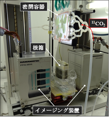実験ではこれらの植物の葉を密閉容器内に入れて、炭素の放射性同位体である炭素11( 11 C)で標識した二酸化炭素( 11 CO 2) を空気と一緒に与えると同時に、RIをとらえるイメージング装置で撮像を始めた。