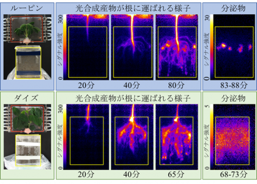 図3に「根圏イメージング」で得られた画像データを示す。上の行はルーピン、下の行はダイズを用いた実験結果を示している。左側の写真のように根箱の中の根は肉眼では見えないが、中央の画像のようにイメージング装置を用いることで根の形にそって運ばれる光合成産物の動きを可視化することができた。ルーピンとダイズにおいて、光合成産物は概ね1時間以内に根の隅々まで運ばれることが分かった。