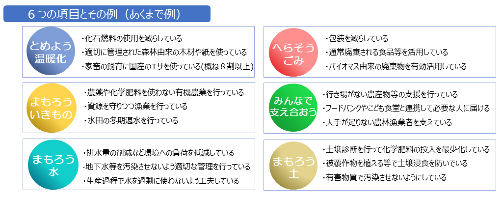 食と農林水産業のサステナビリティに関する6つの項目について