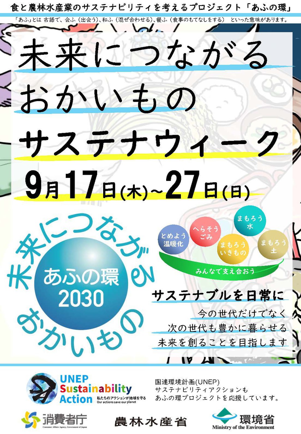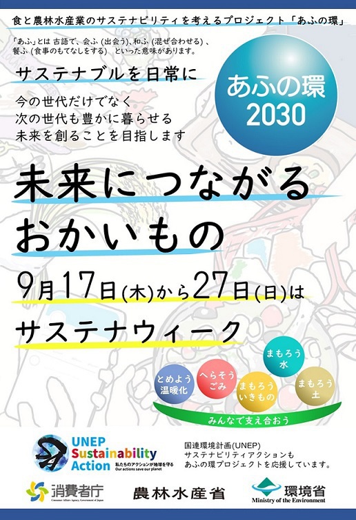 「あふの環(わ)2030プロジェクト~食と農林水産業のサステナビリティを考える~」(以下「あふの環プロジェクト」という)では、第75回国連総会が開催される9月17日(木曜日)から27日(日曜日)まで、サステナウィーク「未来につながるおかいもの」を実施する(農林水産省、消費者庁、環境省連携)。