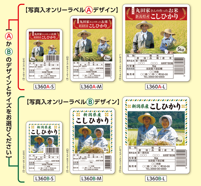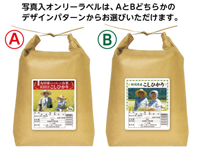 『写真入オンリーラベル』をご注文の際は、(A)と(B)どちらかのデザインをお選びいただく。合わせて、スマートフォンやデジタルカメラで撮った、米生産者様•米販売店の店長様などの人物写真データをマルタカまでお送りいただきましたら、その人物写真データをラベルのデザインに組み入れさせていただく。※低解像度、明暗など、写真データの状態により、仕上がりに影響する場合がある。