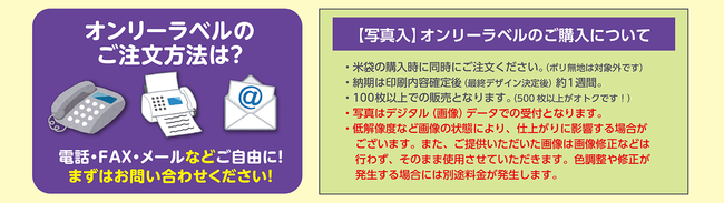米袋の注文だけでなく、ラベルの印刷内容(絵柄•表示枠内)の確認や、人物写真データの引き渡しが必要で、営業担当とのお打ち合わせが必要となる。電話(フリーダイヤル 0120-141-296)・FAX(フリーダイヤル 0120-296-041)・メール等(HPのお問い合わせフォームをご利用ください)でマルタカまでご連絡いただければ、営業担当が『オンリーラベル』の注文方法をご案内する。