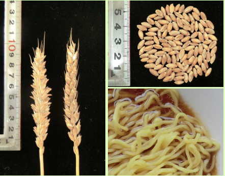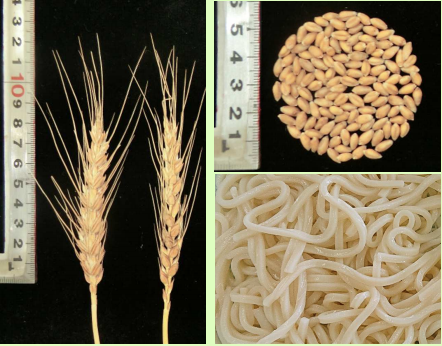 【品種特性の概要】 1 中華麺の県内産主力品種「ハナマンテン」に替わる、超強力小麦である。 2 「ハナマンテン」より耐寒・耐冷性に優れ、秋播性 (長期間低温に遭遇しないと幼穂形成しない性 質 )が強く、暖冬年の凍霜害を受けにくいなど、越冬性がかなり高い。 3 「ハナマンテン」より稈が長いが耐倒伏性に優れ、収量性にも優れる。 4 「ハナマンテン」より赤さび病やうどんこ病の抵抗性が優れる。 5 中華麺の官能評価は「ハナマンテン」と同等である。 6 「ハナマンテン」に対し、出穂期は5日遅く、成熟期は3日遅い中生種である。