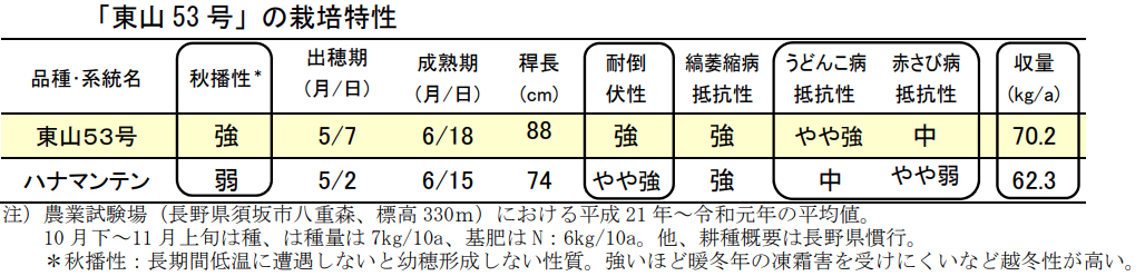○越冬性に優れ、倒伏に強く多収で、小⻨の主要病害に強い特徴がある。
