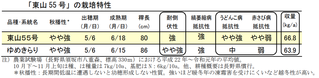 ○越冬性に優れ、倒伏や主要病害に強く、ゆで麺の色は明るい白色である。