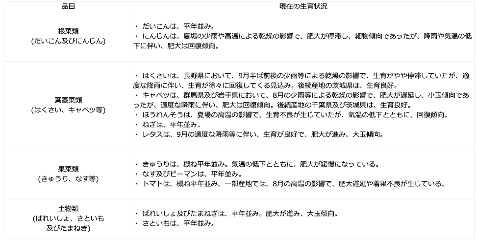 10月の野菜の生育状況及び価格見通し だいこんは平年並み。キャベツは千葉県及び 茨城県は生育良好(農林水産省) |
