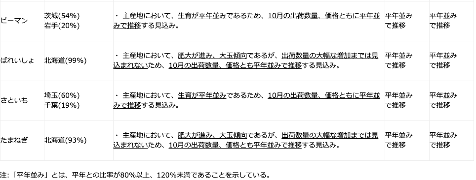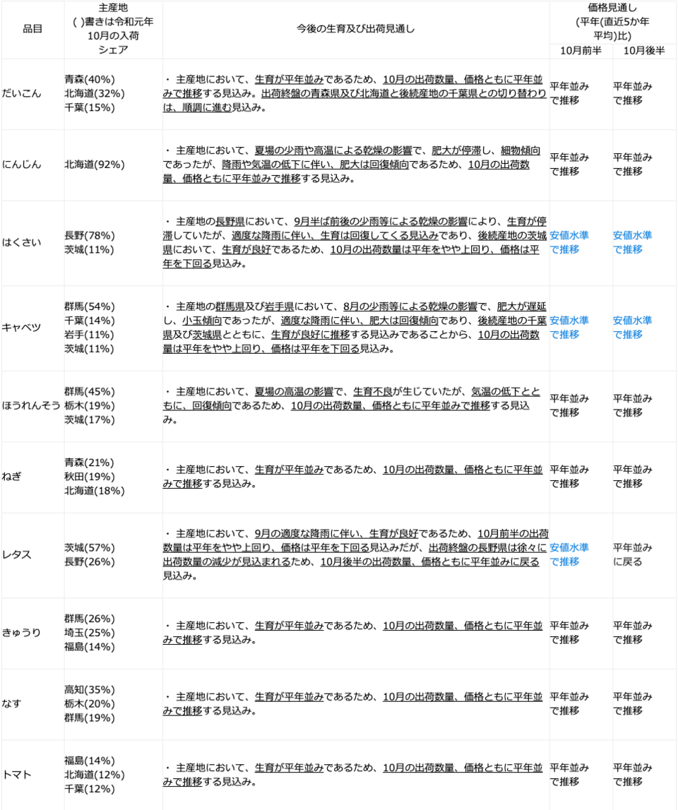 農林水産省は、東京都中央卸売市場に出荷される野菜の生育状況及び価格見通し(令和2年10月)について、主産地等からの聞き取りを行ったので、その結果を公表する。