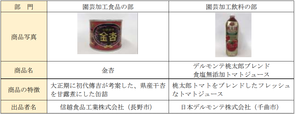 審査員は(一財)食品環境検査協会東京事業所長、(公社)日本缶詰びん詰レトルト食品協会研究所長ほかだ。主な賞は農林水産大臣賞、農林水産省食料産業局長賞、長野県知事賞ほかがある。なお、新型コロナウイルス感染症対策のため関係者のみで開催する。来場時にはマスク着用をお願いしている。