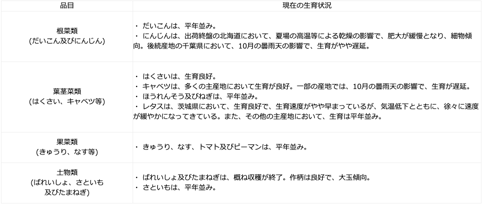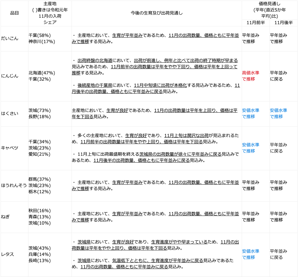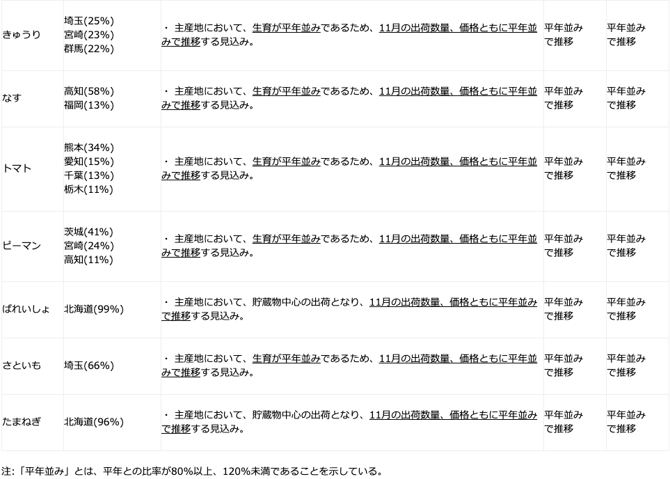 農林水産省は、東京都中央卸売市場に出荷される野菜の生育状況及び価格見通し(令和2年11月)について、主産地等からの聞き取りを行い、その結果を公表している。