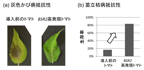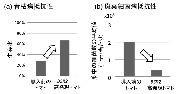 4))に強いトマトを作出した。今後はBSR2遺伝子によって病害に強くなる仕組みを調べ、トマトに限らず多くの作物に対する防除方法の開発を目指す(研究成果)。