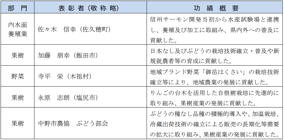 長野県園芸特産業関係功労者表彰は、先駆的、先導的な活動により、本県の園芸特産業の発展に寄与された方(団体)を表彰している。