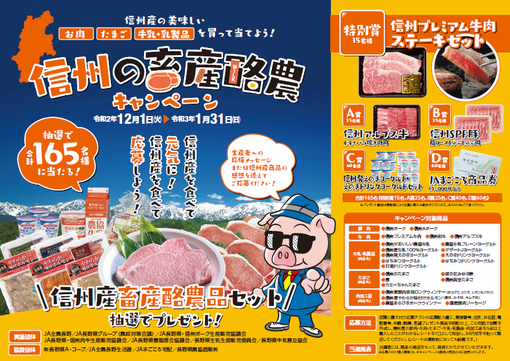 信州の畜産酪農キャンペーン」開催中! 「お肉」「たまご」「牛乳・乳製品」購入レシートの 応募で、信州産畜産酪農品セットなどが当たる(JA) |
