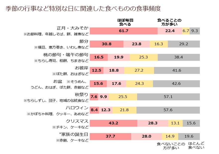 季節の行事など特別な日に関連した食べものを「ほぼ毎回食べる」「食べることの方が多い」と答えた人は、『正月•大みそか』(お節料理、年越しそば、餅、雑煮など)が最も多く、8割以上となった。
