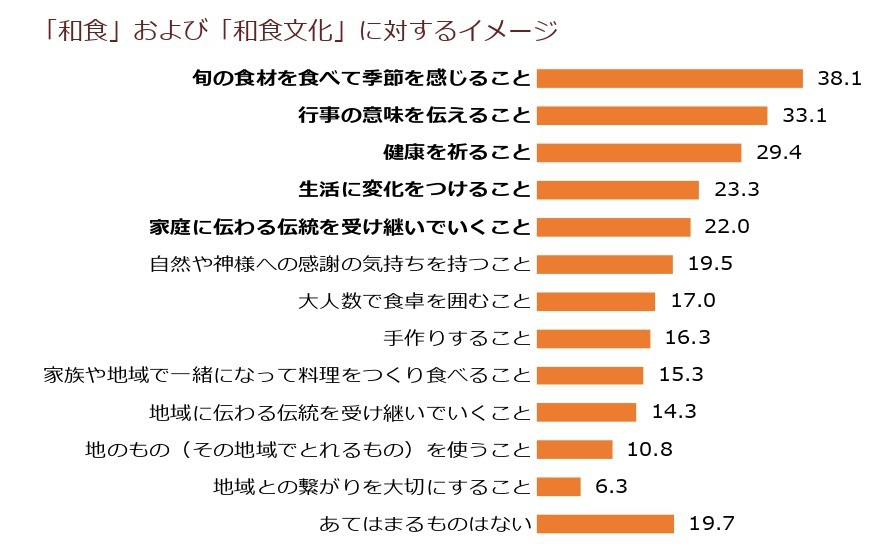 季節の行事など特別な日に関連した食べものについて重要なことは「旬の食材を食べて季節を感じること」(38.1%)、「行事の意味を伝えること」(33.1%)、「健康を祈ること」(29.4%)が上位3つとなった。『和食および和食文化』に対するイメージは「健康に良い」(48.9%)、「季節を感じられる」(44.9%)、「旬のものがおいしく食べられる」(43.7%)が上位3つとなった。