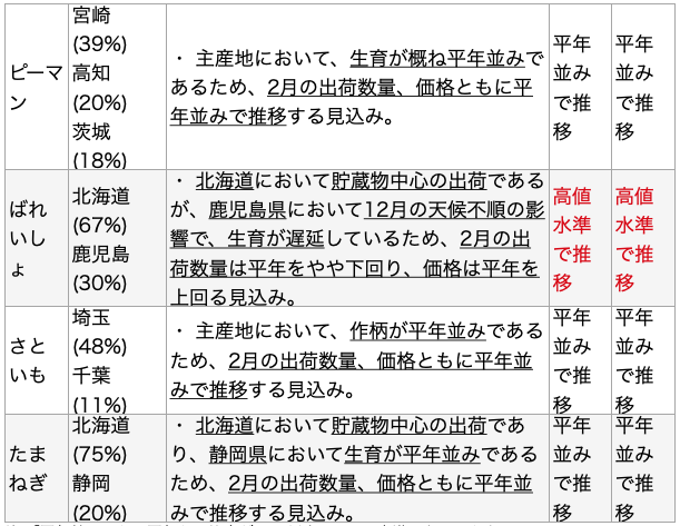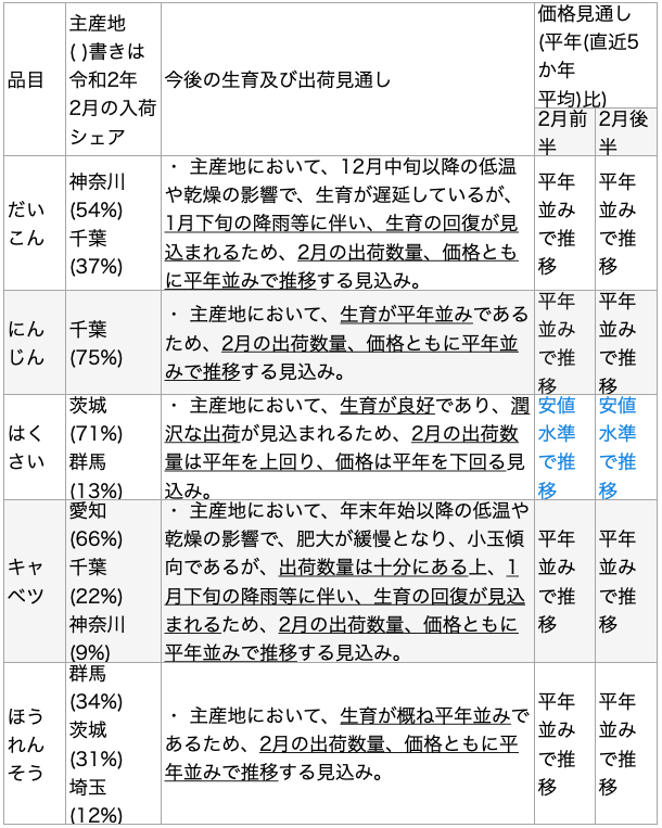 今般、令和3年2月の野菜の生育状況及び価格見通しの聞き取り結果を次のとおり公表している。なお聞き取りを行った14品目の野菜の生育状況は、東京都中央卸売市場外において流通するものについても同様の傾向だ。またこれまでの公表資料は次のURLページで公開している。 https://www.maff.go.jp/j/seisan/ryutu/yasai_zyukyu/