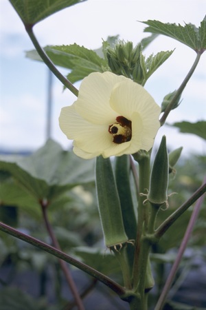 薄い黄色の大きな花を咲かせる。花を食べるために改良された“花オクラ”というものもある。