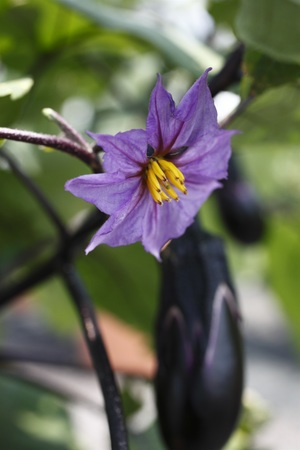 花の色は実と同じ紫色。ナスは花を見ると生育状態が分かるといわれる。花色が濃く大きな花が咲いていると順調だ。