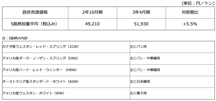 輸入小麦の政府売渡価格の改定 5銘柄加重平均で51,930円/トン 10月期と比べて5.5%の引上げ |