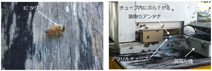 図3 ICタグをつけたミツバチ(左)と巣箱の前のICタグ読取りゲート(右)