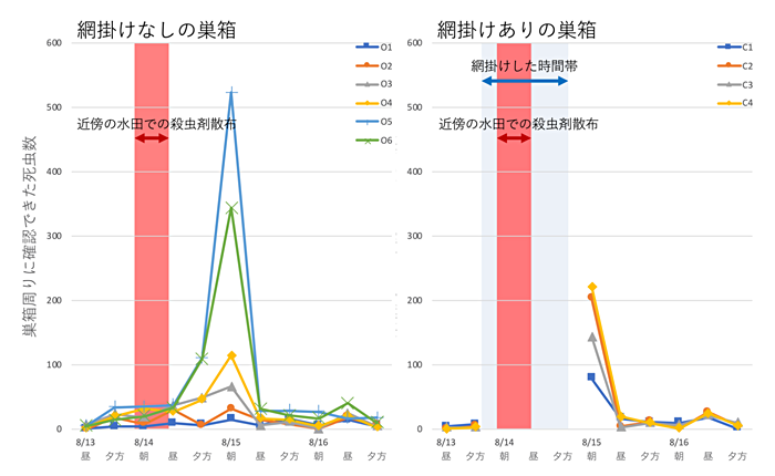 それぞれの巣箱周りで確認された死虫は、朝(8時頃)、昼(12時頃)、夕方(16時頃)の一日3回採取して、その数を数えた。左図が網掛けをしなかった6つの巣箱、右図が網掛けした4つの巣箱(青矢印で示した8月13日夜から14日夜の間に網掛け)での様子を示す。網掛けなしの巣箱(左図)では殺虫剤散布日の夕方から、とくに3つの巣箱(巣箱番号O4、O5、O6)で死虫数が増加し始めて、15日朝にピークを迎え、その後は散布前と同程度の死虫数に低下した。網掛けした4つの巣箱(右図)でも15日朝の死虫数が増えているが、これは網掛けしている間に死虫を回収できないので、その期間の死虫数が累積されているためである。