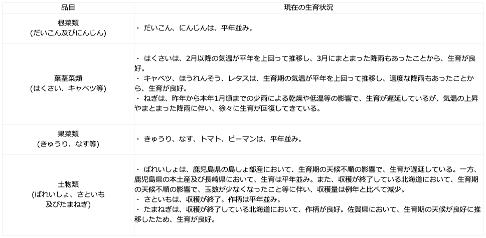 現在の生育状況 今後の生育、出荷及び価格見通し