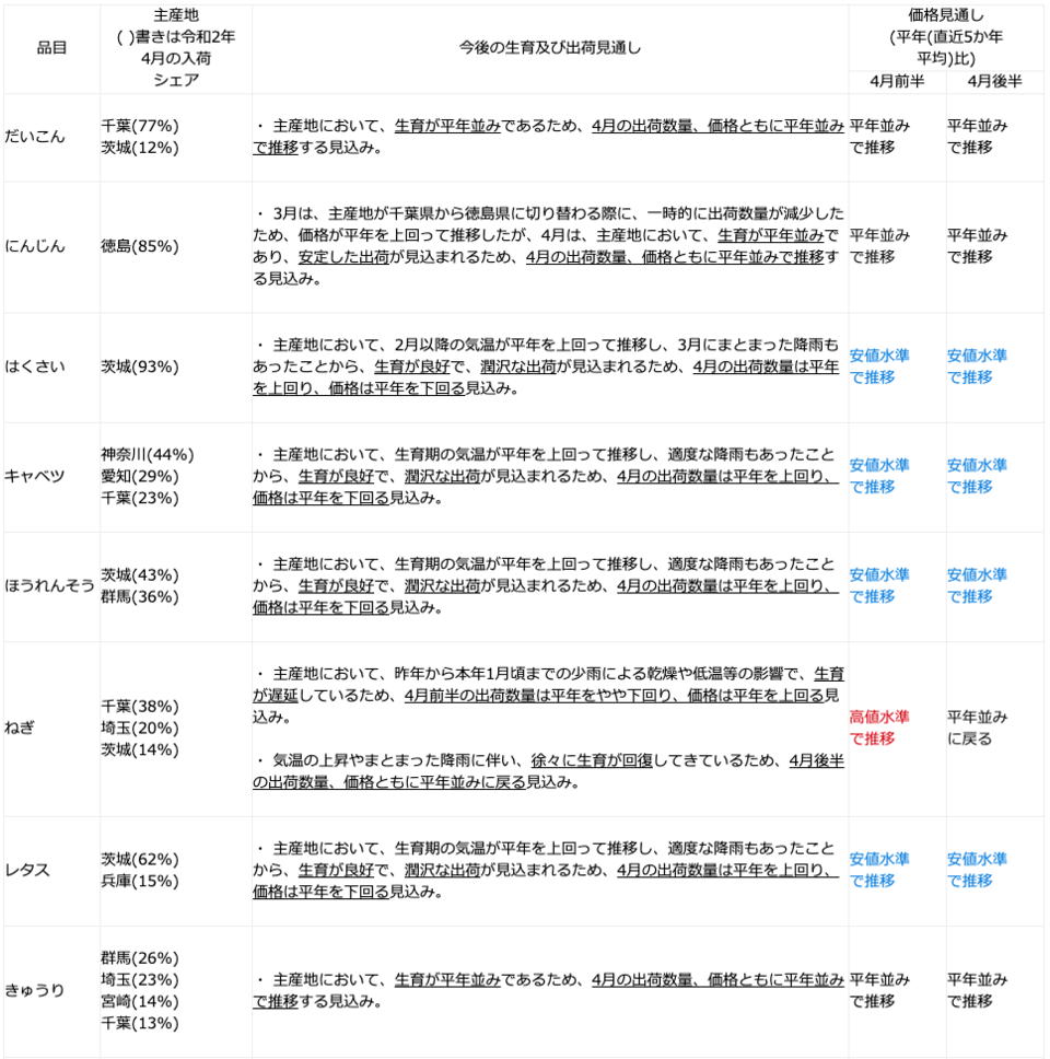 この見通しは、直近の生育状況及び今後の生育と出荷の見通しから予測される、今後の価格見通しを公表することで、産地の出荷判断と消費者の購買行動の最適化を促し、野菜の供給及び価格の安定を図ることを目的としている。このため本見通しにおいて、安値水準で推移することが見込まれる品目については、産地は出荷数量の調整に努めるとともに、消費者は積極的な購入を行う等により消費の拡大に繋がることが望まれる。