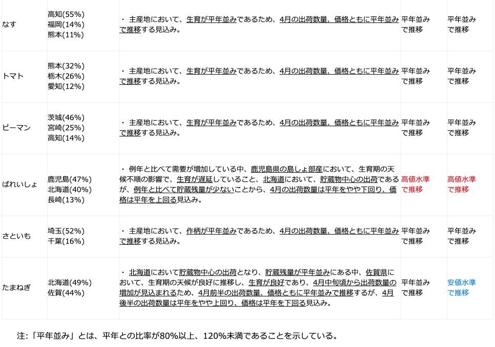 また、高値水準で推移することが見込まれる品目については、産地は出荷数量の調整に努めるとともに、消費者においては一時的に安値品目の購入に切り替える等の行動に繋がることが望まれる。野菜産地では日頃から安定的な生産と供給に努めているが、天候等の影響により出荷数量や価格が不安定になることがあるので、最適な出荷判断と購買行動へのご理解とご協力をお願いしている。注:「平年並み」とは