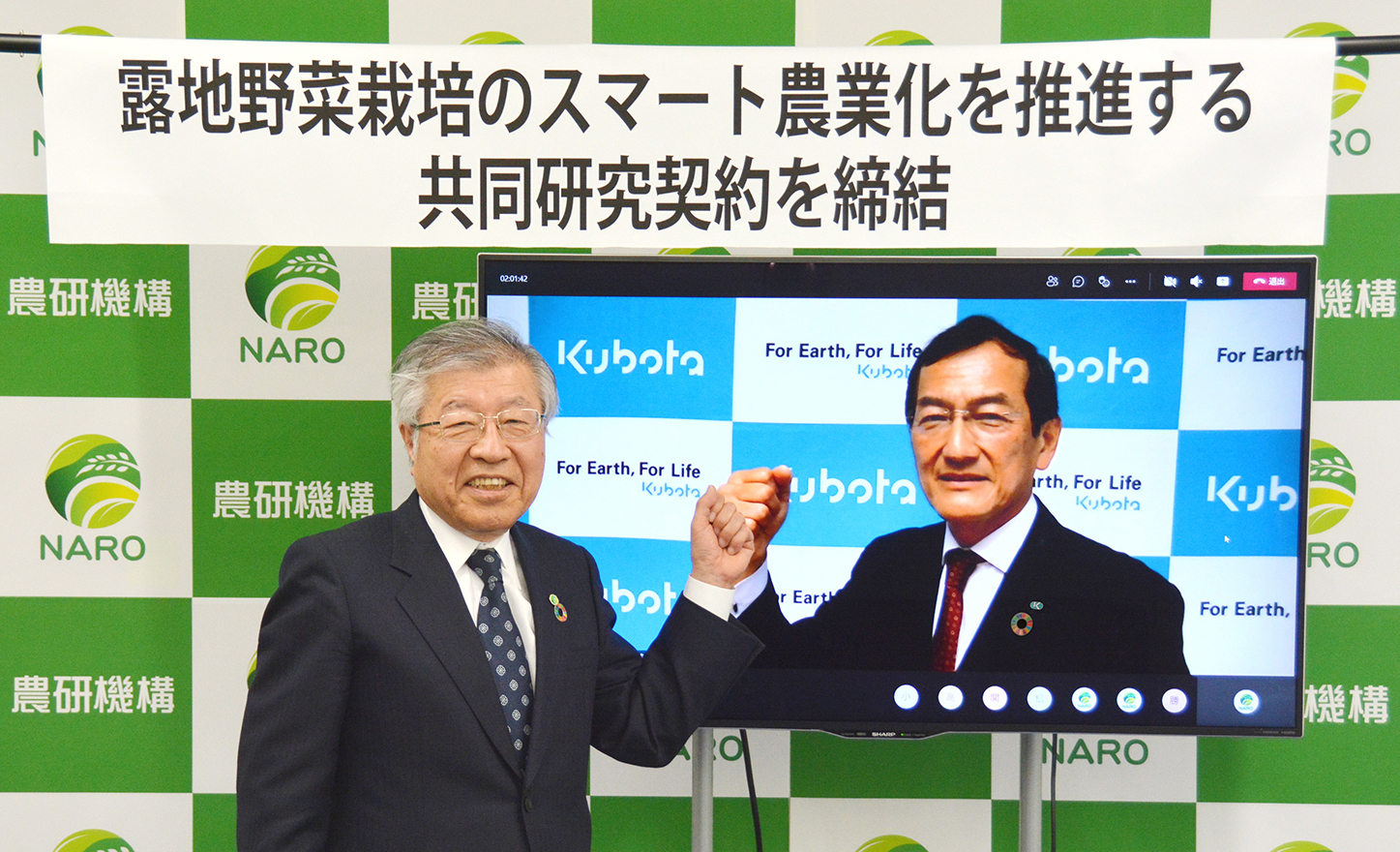 (株)クボタ(本社大阪市浪速区、北尾裕一代表取締役社長)と、国立研究開発法人 農業•食品産業技術総合研究機構(本部茨城県つくば市、久間和生理事長)は、露地野菜栽培における、生育情報を活用したスマート生産システムの共同研究契約を締結した。データに基づく栽培管理技術や生育モデルの構築を通じて、露地野菜栽培のスマート農業化に貢献する。
