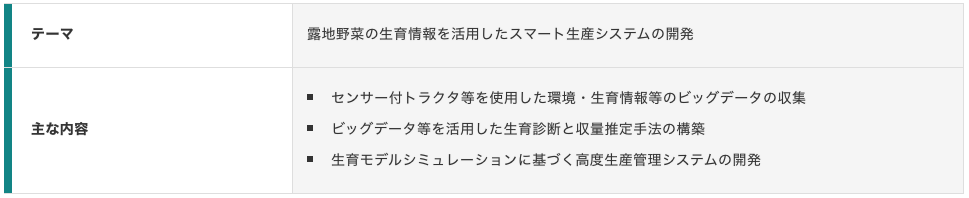 ・クボタと農研機構は、土壌データ等の環境データや生育データの収集手法を確立し、環境•生育情報等のビッグデータに基づく露地野菜の収穫時期•収穫量の予測や、栽培改善等のスマート生産管理システムを共同開発する。データを活用した生産管理技術を確立し、収量•品質の向上に繋げていく。