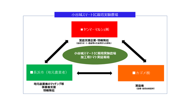 3者は小谷城スマートIC栽培実験農場での実証栽培を機に連携•協力し、長浜市における加工用トマトの産地化を目指している。2021年4月に農場への植え付けを行い、同年夏頃の収穫を目指している。