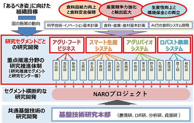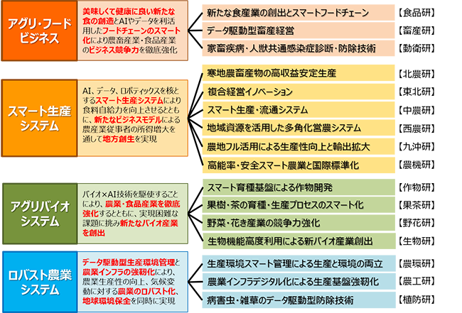 農研機構第5期中長期計画をスタート、4つの研究の 柱(セグメント)「アグリ•フードビジネス」「スマート生産システム」 「アグリバイオシステム」「ロバスト農業システム」を推進 |