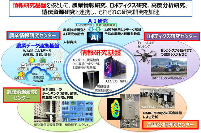 基盤技術研究本部は4つの研究センターからなるが、その中核は2018年10月に設置した農業情報研究センターだ。同センターの情報研究基盤を徹底的に活用し、データを一元的に管理することにより、相互に有機的に結びつける。同センターはその他、農業AI研究や農業データ連携基盤" WAGRI 1)"の運営を行う。