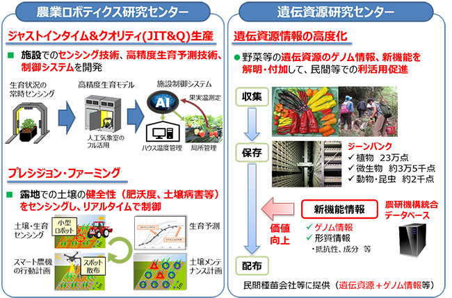 また、農業ロボティクス研究センターでは、ジャストインタイム&クオリティ生産として、センシング技術、高精度生育予測技術、制御システムを開発する。遺伝資源研究センターでは、遺伝資源情報の高度化として、遺伝資源のゲノム情報、新機能を解明•付加して、民間等での利活用を促進する。