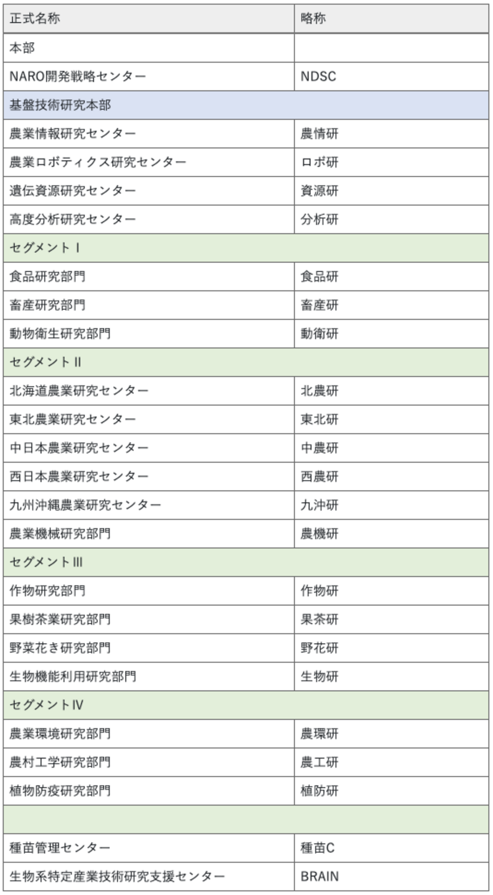 農研機構の各研究所は、この4つのセグメントの下で各々大課題を担当する。そして各セグメントを担当する研究推進担当理事が、その役割と権限と責任を明確にして、組織運営と課題推進の両方をマネジメントする形に変更した( 図2;正式名称は 表1参照)。