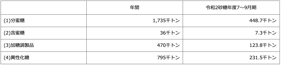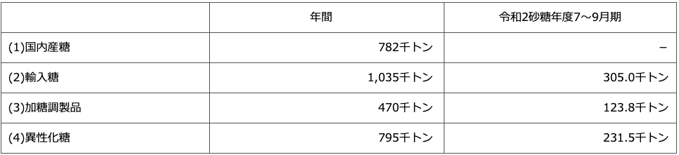 農林水産省は、砂糖等に関して適切な価格調整を図るため、令和2砂糖年度及び同年度7~9月期における砂糖及び異性化糖の需給見通しを作成した。