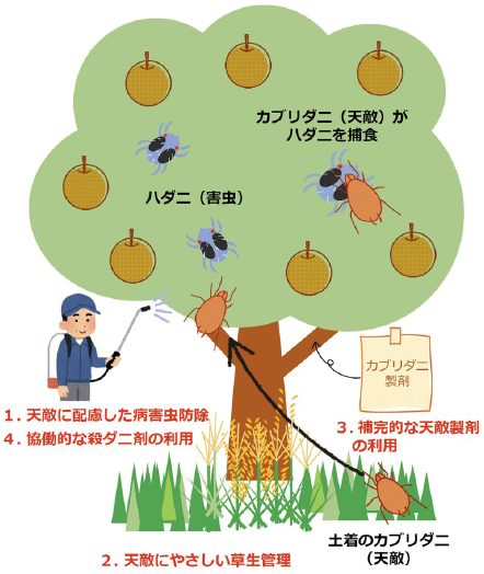 リンゴやナシでは年3回程度の殺ダニ剤散布が慣行的に行われている。農研機構が代表を務める農食事業28022Cコンソーシアムでは、"果樹園に自然に生息する土着のカブリダニ(土着天敵)"と